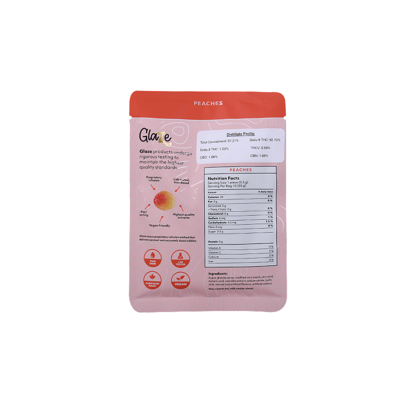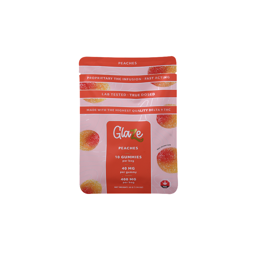 Experience the juicy sweetness and potency of Peaches Box by Glaze. Each box contains ten bags, meticulously dosed at 400mg each, offering a flavorful and potent cannabis experience.